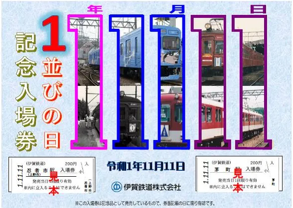 伊賀鉄道では、令和1年11月11日が1並びの日付となるのを記念して、『1並びの日記念入場券』を2種類発売します。内容については次のとおりです。