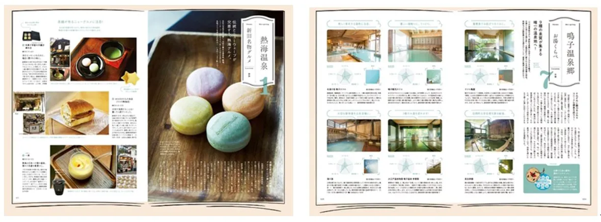 読んでいるだけでわくわくするような、楽しくてちょっぴり新しい、まさに保存版!といえる温泉本です。温泉地で今注目のスイーツやグルメスポット、ディープな温泉情報など、読み応え抜群の内容となっています。