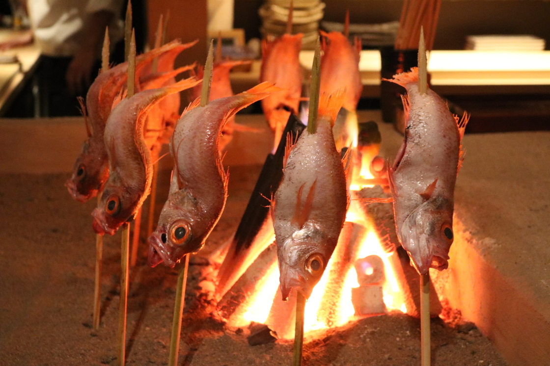 (1) 世界最古の調理方法、それが「原始焼き」。シンプルだからこそ素材の味と旨味がそのまま表れ、表面はパリッと香ばしく、中はふっくらと仕上げる魚を一番おいしく食べられることのできる最高の焼き方です。2018年に原始焼火鉢を立ち上げた料理長の高橋 伸弥が、自ら全国各地を周り、仕入れ先を開拓した旬の鮮魚と一品料理が売りです。