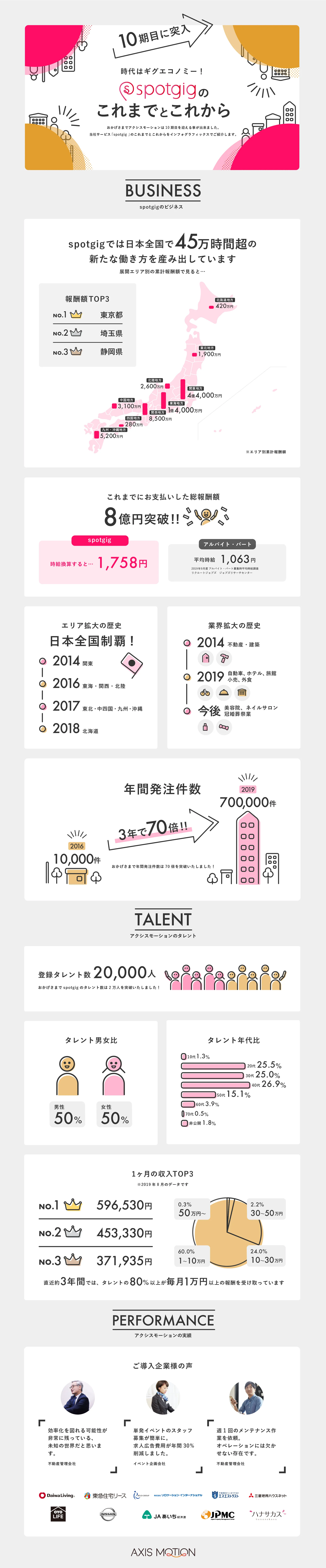 必要な時に必要な人材を確保したい企業と、スキルや経験を活かして働きたい人をオンデマンドにマッチングさせ、多様な働き方を可能にするギグ・エコノミープラットフォーム『spotgig(スポットギグ)』を提供するアクシスモーション株式会社(本社:東京都千代田区、代表取締役:田中 祥司)は、2019年7月で10期目を迎えることができました。