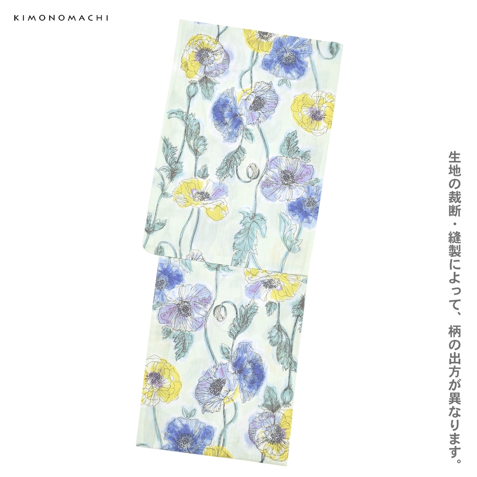 ごく淡い白緑色の地。ペン画調の細い線で描かれた雛罌粟の花が縦向きに配置されています。あざやかな青や青紫、淡いパープルに明るい黄色の花、淡いアンティークグリーンの葉。