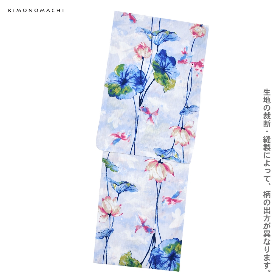 白地にごく淡い紫みの青のぼかし。水彩調の蓮は、深い紺に藍色、黄緑の挿し色の入った葉、その間から長く伸びた茎の先にやわらかな赤紫に色づいた花、ベージュの影。夏の夢のような世界をふわふわと浮かび泳ぐ金魚たち。