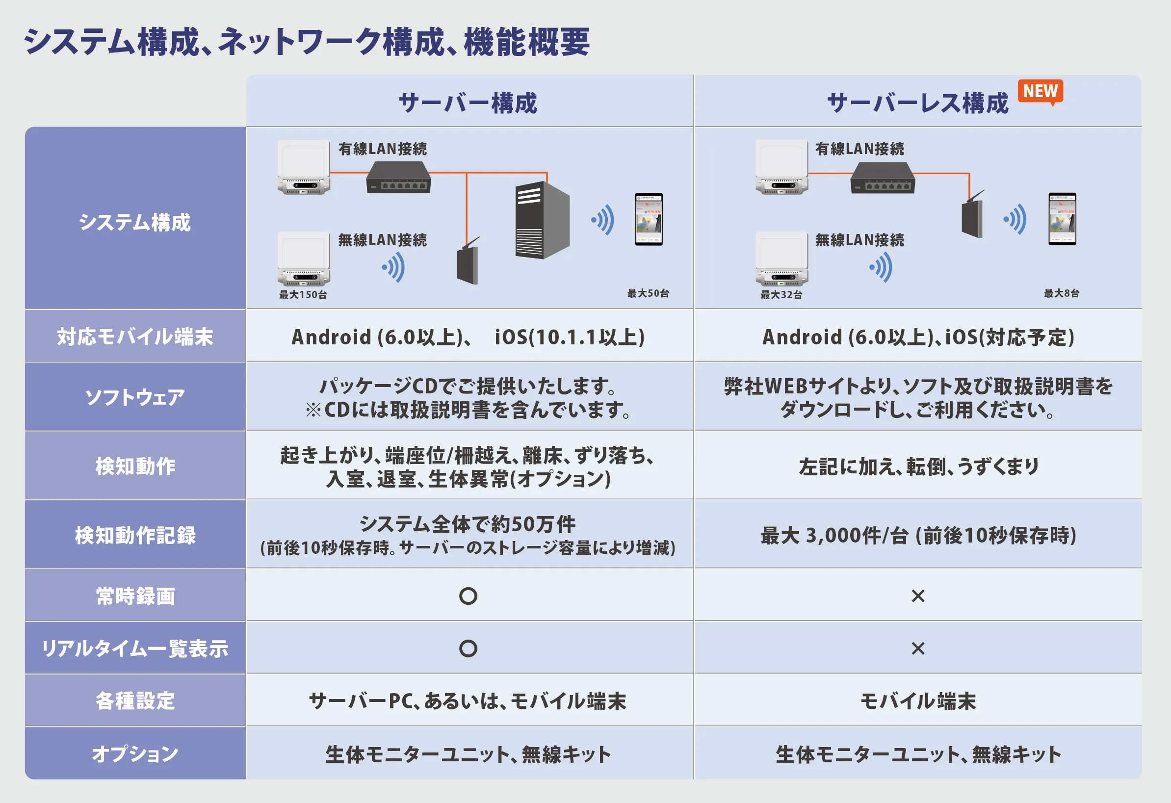 販売中のサーバーを設置するモデルは、集中管理によるきめ細かい介護サービスの提供に貢献し、市場で高い評価をいただいております。一方で、初期投資を抑えたいというお客様もおられるため、これらのお客様のニーズにお応えし、検知精度はそのままに、一部の管理機能を見直すことでサーバー設置を不要とするモデルを開発いたしました。