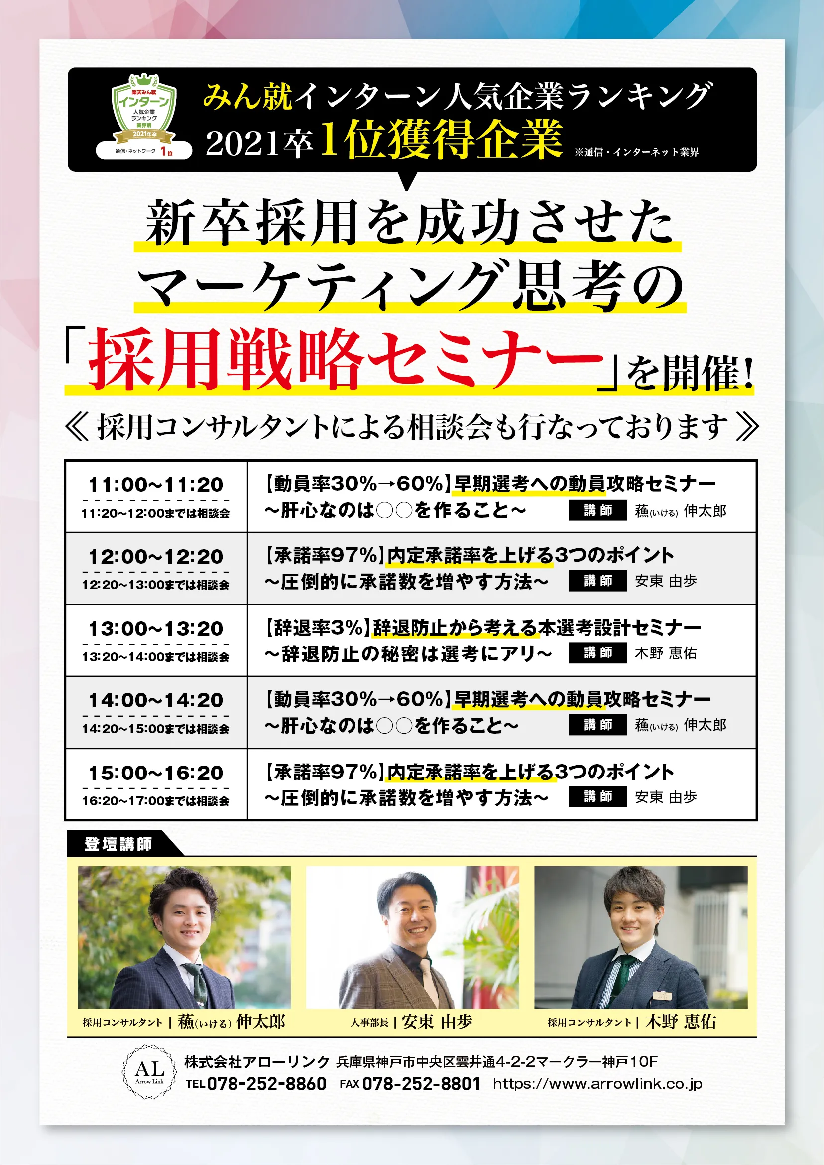 株式会社アローリンク(本社:兵庫県神戸市、代表取締役社長:上村 計明)は、2019年11月13日(水)~15日(金)の3日間、インテックス大阪で開催される人事業務支援の商談専門展 第4回 [関西] HR EXPO に出展します。採用活動を開始し5年目、楽天みん就「インターン人気企業ランキング」通信業界部門にて一位を獲得したノウハウを、HR EXPOにて大公開します。