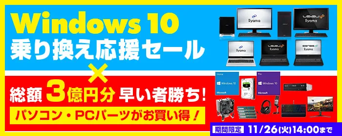 パソコン工房・グッドウィルを運営する株式会社ユニットコム(代表取締役:端田 泰三、本社:大阪市浪速区)は、パソコン工房Webサイトにて、2019年10月29日(火)から2019年11月26日(火)14:00までの期間限定で『Windows 10乗り換え応援セール×総額3億円分早い者勝ち!』を開催中です。