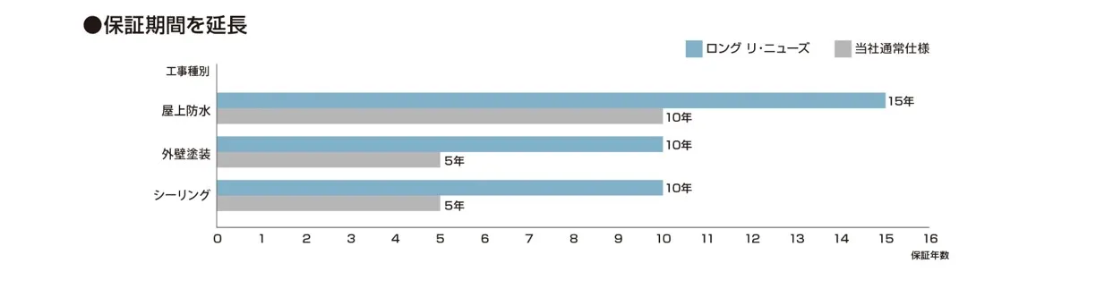 「Long re-News」(ロング リ・ニューズ)は、高耐久材料と工法を使用し、当社責任施工によって工事品質を上げることで、施工後の耐用年数を長くし、併せて当社の保証期間を最大5年間延長、工事周期も延長することで、大規模修繕工事累計額の軽減を実現します。