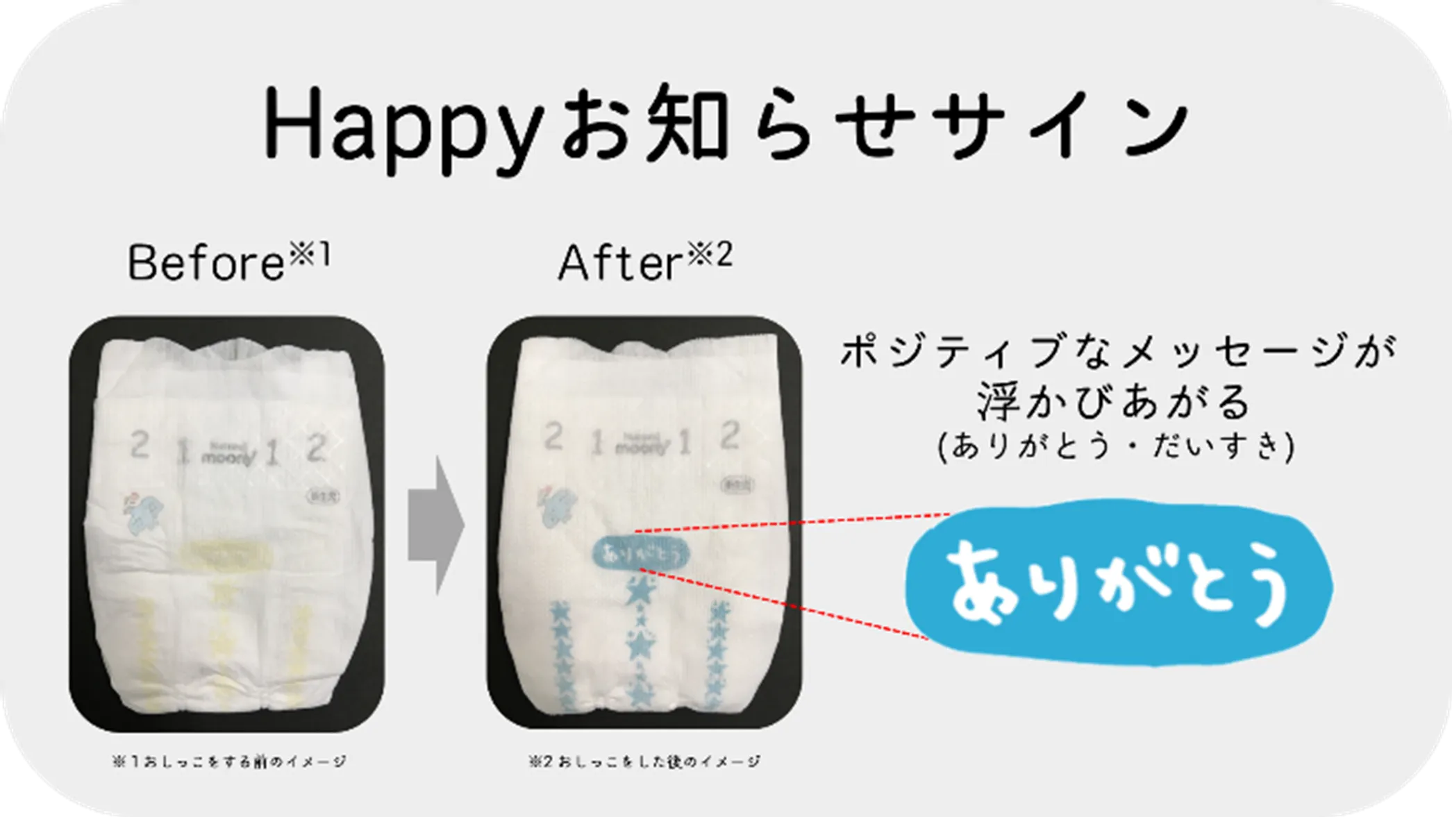 赤ちゃんがおしっこをすると「ありがとう」「だいすき」といったポジティブなメッセージが浮かびあがる“Happyお知らせサイン”を採用しました。