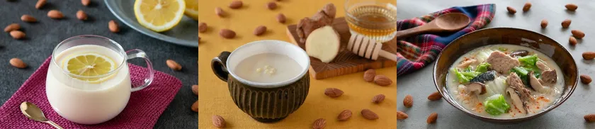 寒い冬に飲みたいのが、スープやホットドリンクなどのホットメニューです。アーモンドミルクは、ビタミンEが豊富なので、血流促進効果も期待できて冷え対策におすすめです。柴田 真希先生の新作アーモンドミルクメニューを3品ご紹介します。