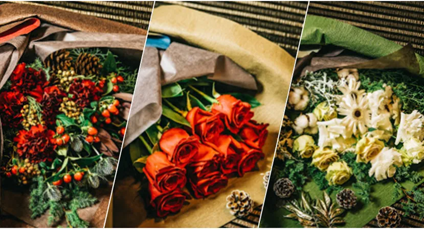 プロポーズの定番アイテム「花束」。特別な日に渡される花束は、恋人の幸せな気持ちをより一層高めてくれるはず。クリスマスをイメージした限定デザインの花束は3種類からお選びいただけます。