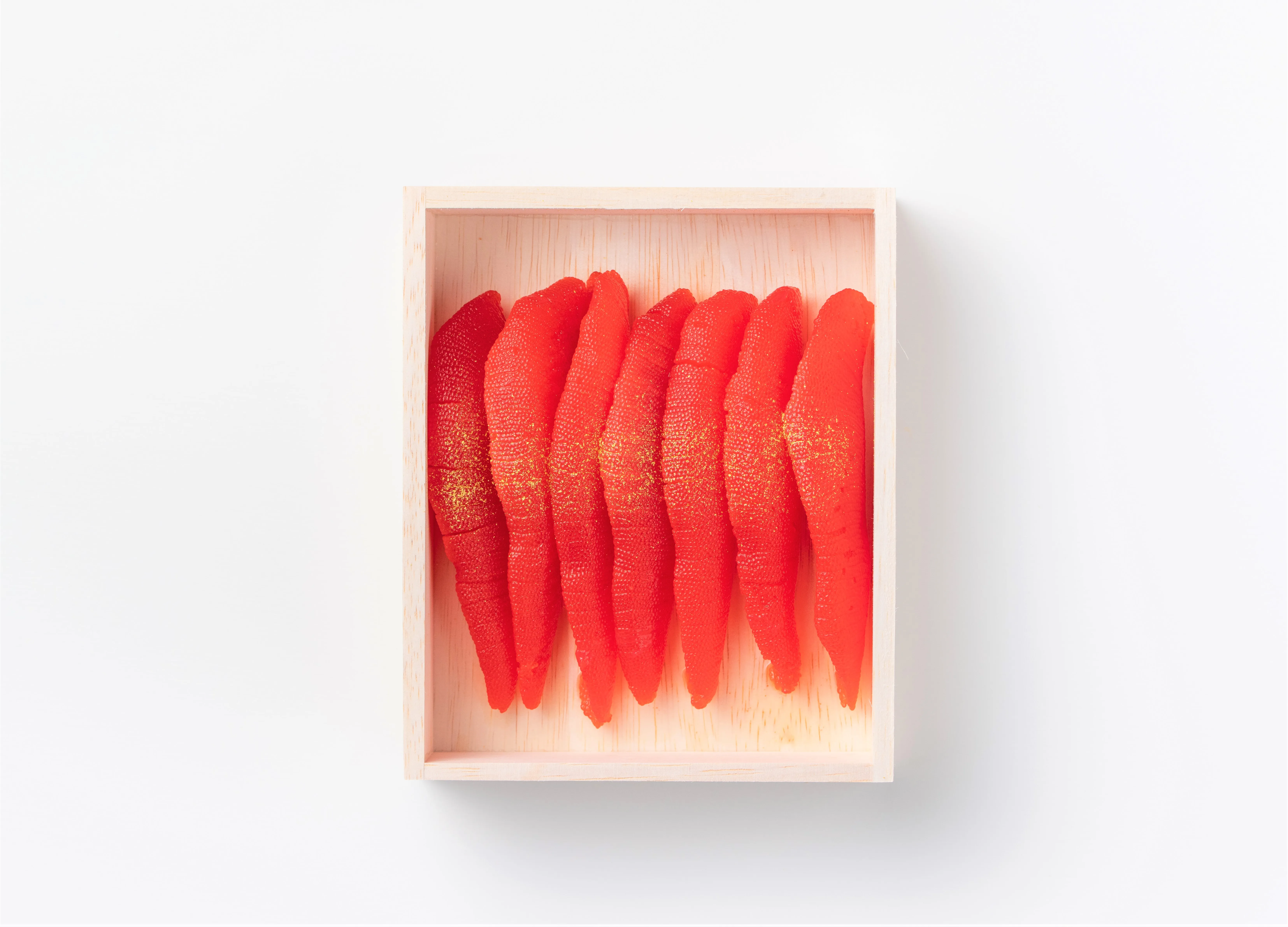 めんたいこの原料となる、オホーツク海の漁船で獲れたスケソウダラの卵の中に、数の子の原卵であるニシンの卵が少量混ざって届いたことがありました。そこで試しに、めんたいこと同様に秘伝の調味液に漬け込み低温熟成させたところ、今までに見たこともない、真っ赤で美味しい数の子ができあがりました。