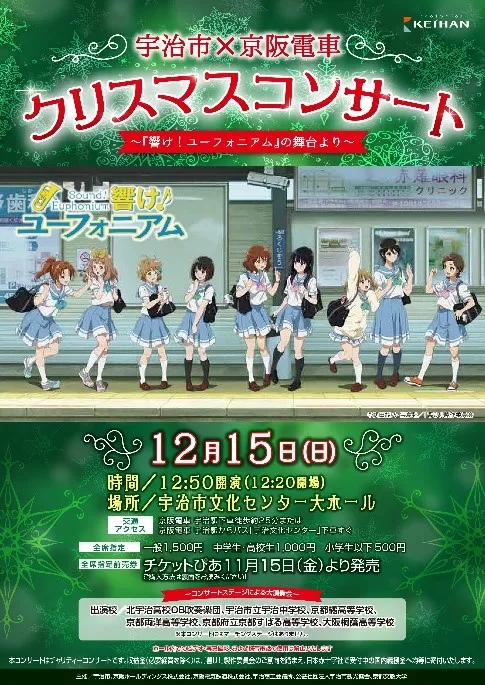 京阪ホールディングス株式会社(本社:大阪市中央区、社長:石丸昌宏)と京阪電気鉄道株式会社(本社:大阪市中央区、社長:中野道夫)は、宇治市(市長:山本正)、宇治商工会議所(会頭:山本哲治)、公益社団法人宇治市観光協会(会長:中村藤吉)、京都文教大学(学長:平岡聡)と共同で、アニメ「響け!ユーフォニアム」とのコラボレーション企画として、吹奏楽イベント「宇治市×京阪電車 クリスマスコンサート~『響け!ユーフォニアム』の舞台より~」を2019年12月15日(日)に宇治市文化センターで開催します。