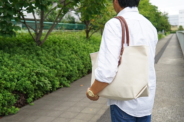 温かみのあるキナリ色の帆布を使った、シンプルなデザインのトートバッグ