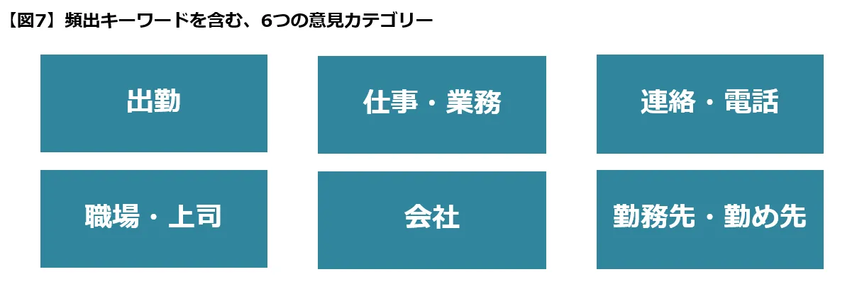 6:災害時の勤め先への不満に関する頻出ワード「出勤」「連絡・電話」「職場・上司」。(図7)