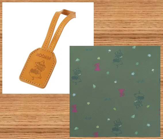 スナフキンのエンボスが入った牛革のタグが、カワイイワンポイントに。