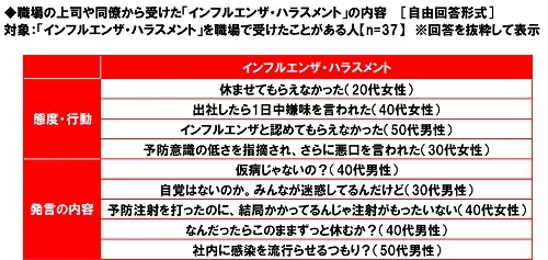 “インフルエンザ・ハラスメント”を職場で受けたことがある人(37名)に、職場の上司や同僚から受けた“インフルエンザ・ハラスメント”の内容を聞いたところ、態度や行動については、「休ませてもらえなかった」(20代女性)や「出社したら1日中嫌味を言われた」(40代女性)、「インフルエンザと認めてもらえなかった」(50代男性)といった回答が挙げられました。発言の内容については、「仮病じゃないの?」(40代男性)や「自覚はないのか。みんなが迷惑してるんだけど」(30代男性)、「予防注射を打ったのに、結局かかってるんじゃ注射がもったいない」(40代女性)、「なんだったらこのままずっと休むか?」(40代男性)といった回答がみられました。つらい思いをして治して出勤したにもかかわらず、弱った体に追い打ちをかけるようなハラスメントを受けたという実態が明らかとなりました。