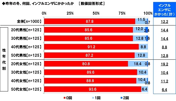 次に、昨年の冬、何回、インフルエンザにかかったか聞いたところ、「0回」は87.8%となったのに対し、「1回」は11.5%、「2回」は0.7%で、合計した『インフルエンザにかかった(計)』は12.2%でした。ビジネスパーソンの8人に1人が、昨年の冬にインフルエンザにかかったようです。