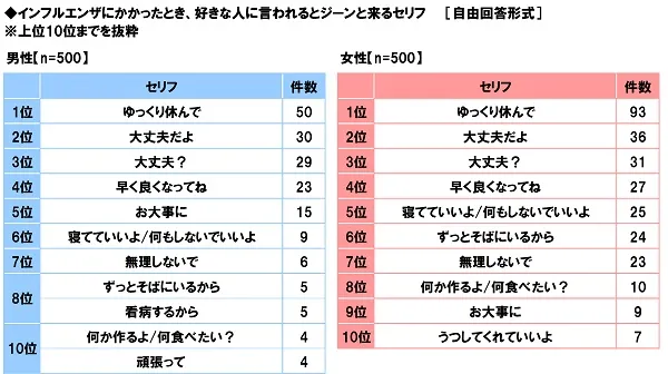 全回答者(1,000名)に、インフルエンザにかかったとき、好きな人に言われるとジーンと来るセリフを聞いたところ、男女とも1位は「ゆっくり休んで」(男性50件、女性93件)、2位は「大丈夫だよ」(男性30件、女性36件)、3位は「大丈夫?」(男性29件、女性31件)となりました。