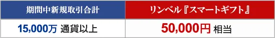上記に加えて、期間中に新規15,000万通貨以上取引されたお客様には、リンベル『スマートギフト』をプレゼントいたします。
