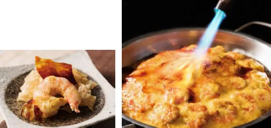 大人気の海老マヨをアレンジ。その場でバーナーで炙って仕上げます。パリパリ食感の揚げワンタンとご一緒に。