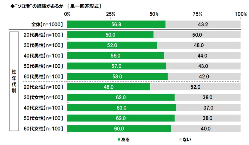 全回答者(1,000名)に、“ソロ活”の経験があるか聞いたところ、「ある」は56.8%となりました。ビジネスパーソンの半数以上が、ソロ活を経験していることが判明しました。ソロ活経験がある人の割合を性年代別にみると、最も高かったのは40代女性(63.0%)でした。また、最も低かったのは20代女性(48.0%)で、各年代・性別で唯一、半数以下となりました。