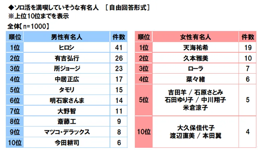 まず、全回答者(1,000名)に、ソロ活を満喫していそうな有名人を聞いたところ、男性有名人では、1位「ヒロシさん」、2位「有吉弘行さん」、3位「所ジョージさん」となりました。1位のヒロシさんは、かつて「ヒロシです」のネタで一世を風靡しましたが、現在はソロキャンプの達人としてのイメージが浸透しているようです。女性有名人では、1位「天海祐希さん」、2位「久本雅美さん」、3位「ローラさん」となりました。