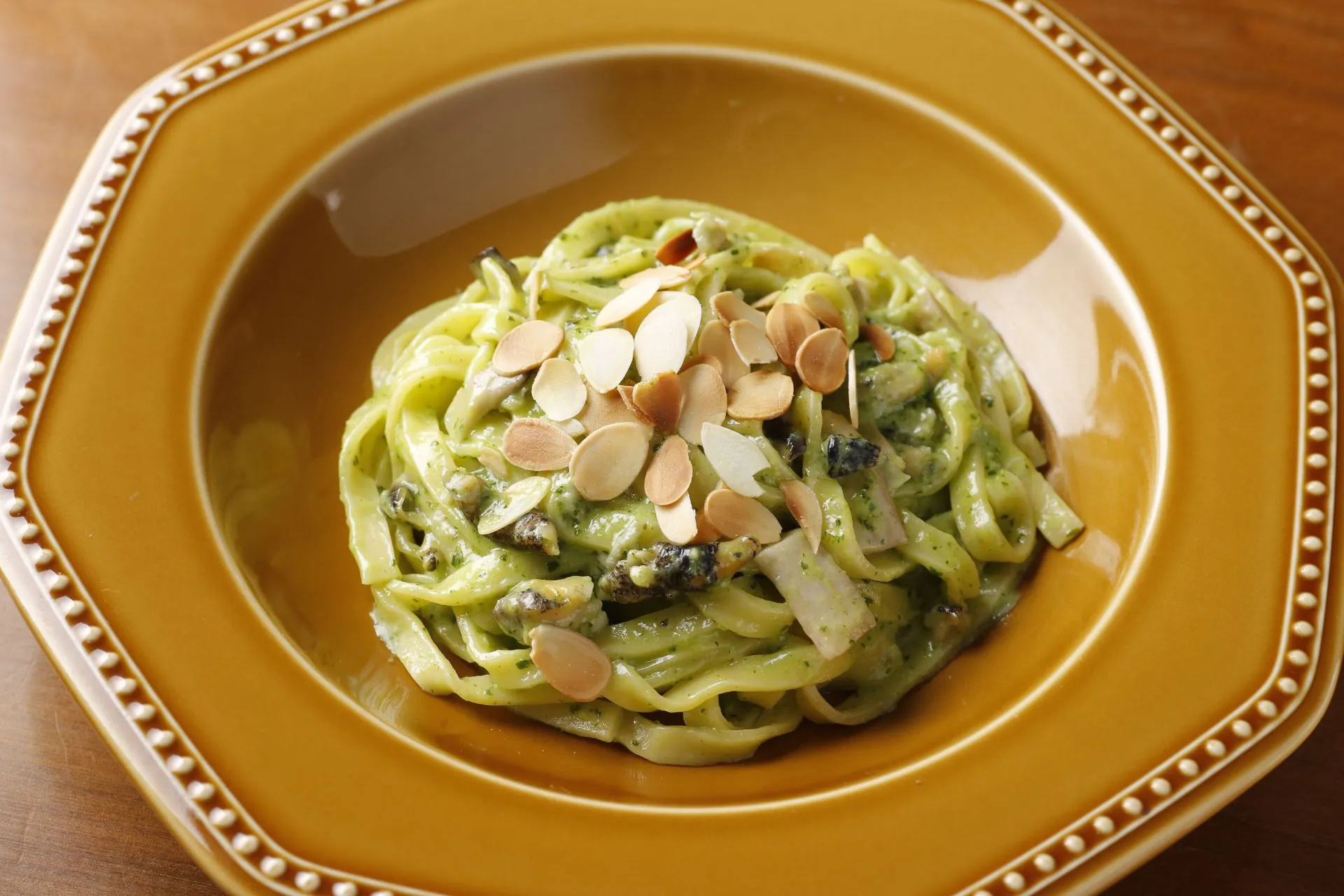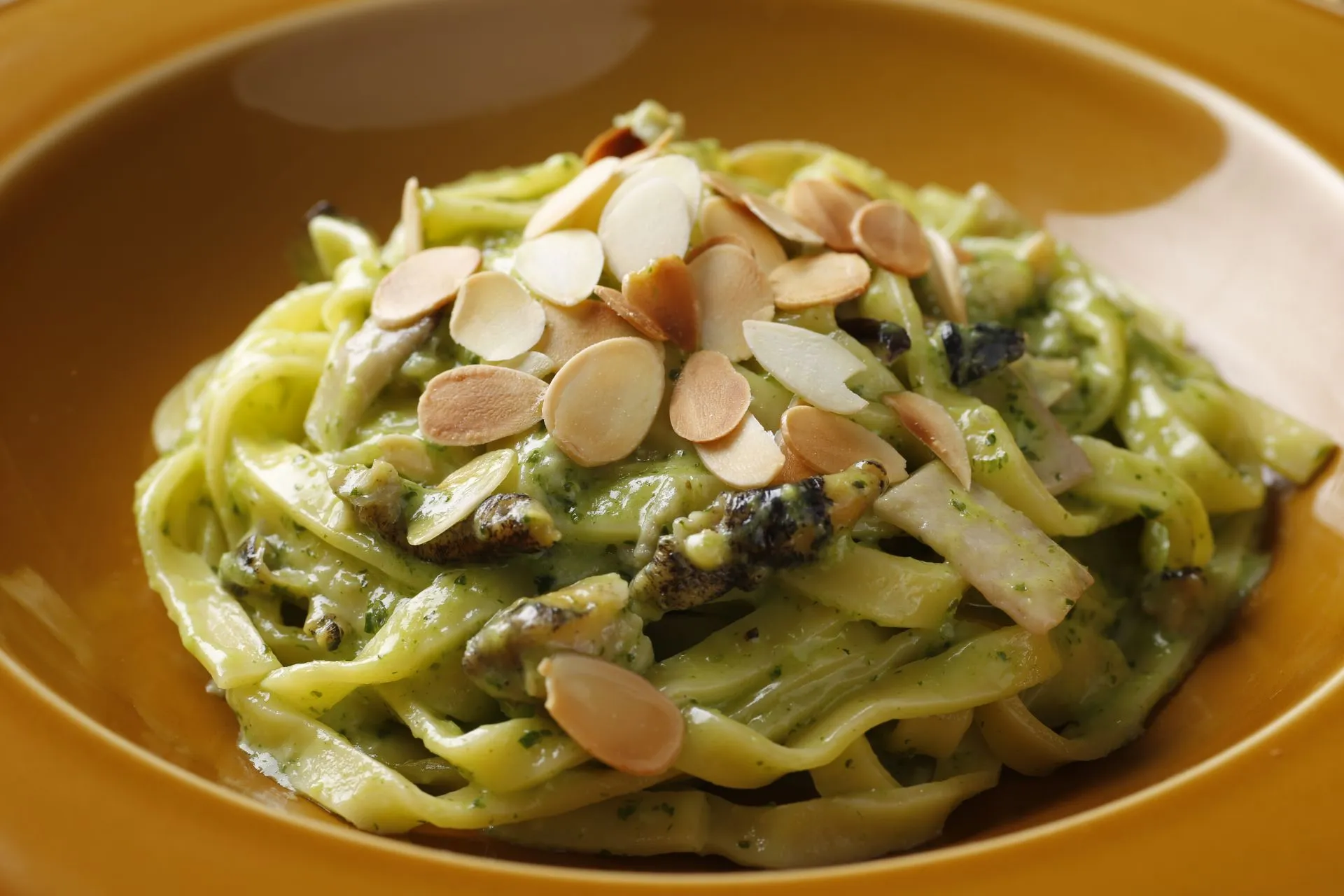 フランスきっての美食の街、ブルゴーニュ地方の名物料理「エスカルゴ・ア・ラ・ブルギニョン」。マルタンシェフがこの料理にヒントを得て、味のポイントである「ブルゴーニュバター」をアレンジしてパスタソースに仕上げました。フレッシュパセリとにんにくを加えたバターに生クリームでコクを重ね、北海道産のつぶ貝をメインにしています。つぶ貝は絶妙な火加減で柔らかく適度に歯ごたえのある食感に。パセリの鮮やかな緑色が美しく、ふんだんに使ったバターとにんにくの香りが食欲をそそります。