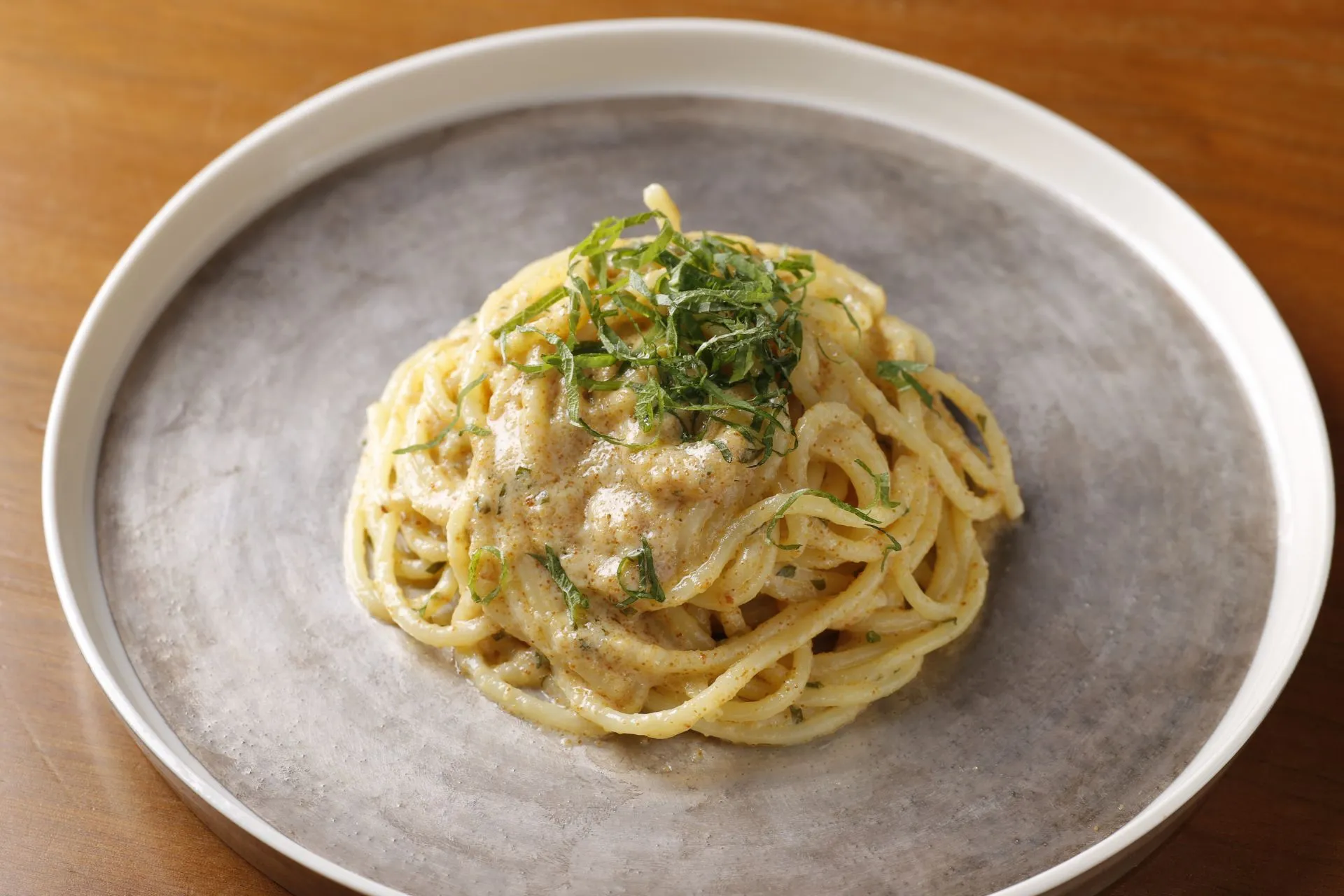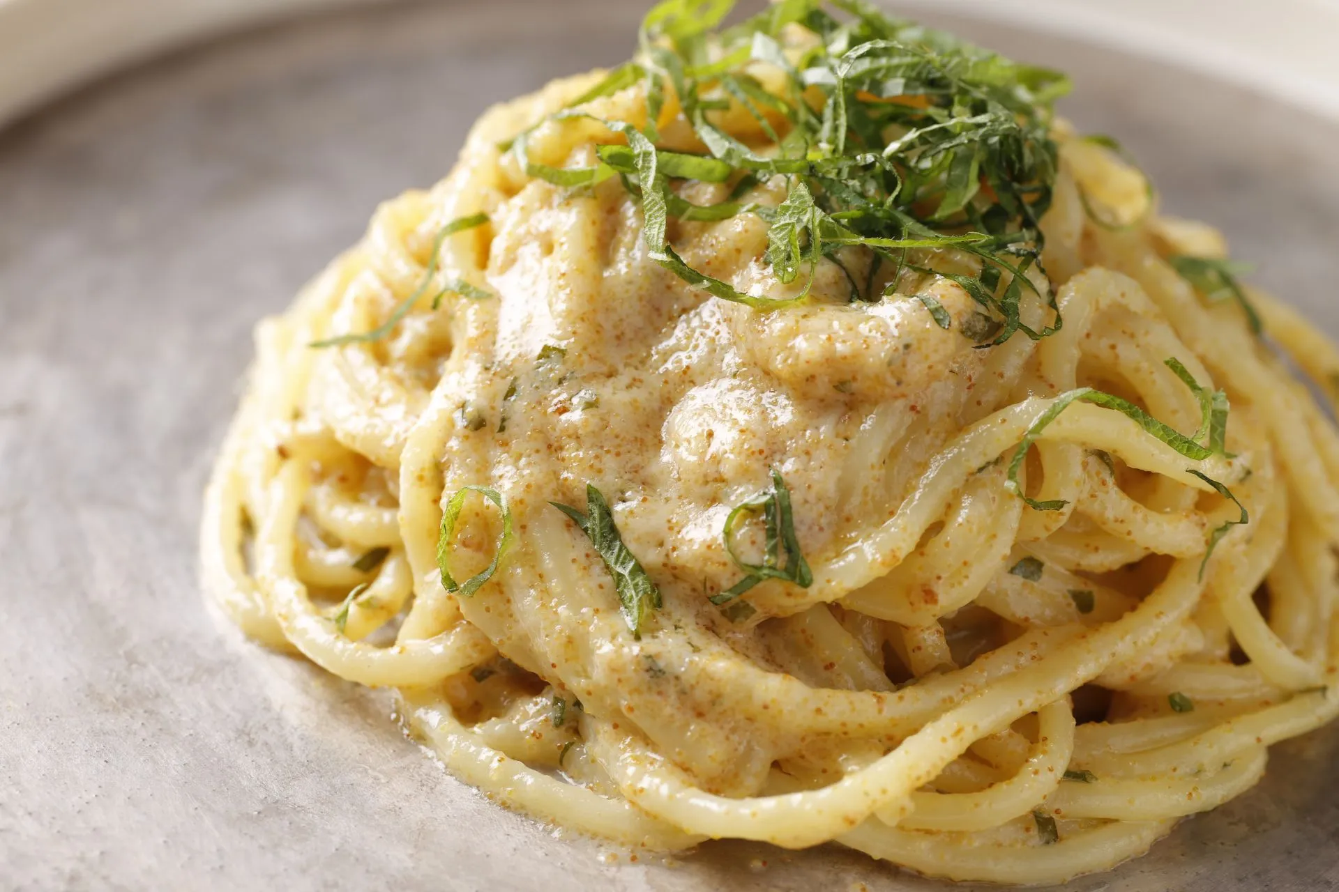 長崎県産のボラの卵巣を使った本からすみのパウダーをたっぷり使用。チーズのように濃厚な味わいと独特の旨みやコクが存分に楽しめる、贅沢なパスタソースです。からすみは身体を温める作用があるとされていて、これからの寒い季節にもぴったり。フランス料理風に生クリームとバターを加えたリッチな味わいながら、最後まで美味しく召し上がっていただくため重くなりすぎないように仕上げました。細かく刻んだ大葉が爽やかな香りと彩りを添えています。