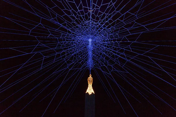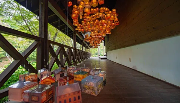 本年8月に行われた「阪神なんば線ミーツ・アートinあまがさき Produced by六甲ミーツ・アート 芸術散歩」で展示した作品です。家々の明かりは私たちにぬくもりや郷愁を感じさせますが、作者は尼崎の商店街を取材し、実在の商店や建物をもとに数多くのランタンを作り本作品としました。美しく仄かな町の記憶が遠く六甲山までやってきたわけです。