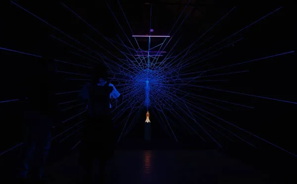 生命科学、自然現象、哲学の視点を織り交ぜながら発表を続けている作者が滞在制作した作品です。六甲山は霧が非常に多く発生することから、当作品では大気光学現象のブロッケンをテーマにしています。光輪とも呼ばれるこの現象は稀に高山などで見られ、人物などの影が霧や雲に投影される際に中央の影の周りが虹のように光るものです。中央には表面を残して薄くくりぬかれた人型の木彫りがあり、周囲には二進法により定められた手順で0.2mmの絹糸が張り巡らされています。絹糸はかつて神戸において重要な輸出産業であったことから選ばれた素材です。