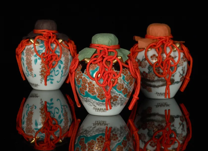 パルファン サトリがオリジナルで作成した、日本を代表する3種の花、梅・藤・桜の茶壷型の香水瓶に、「サトリ -Satori-」を大切に納めました。