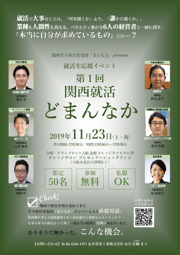 関西の老舗企業の若手経営者集団「まんな会」は、2019年11月23日(土)に将来就職を考えている全学生を対象にした就活生応援イベント、「第1回関西就活どまんなか」を大阪市北区・グランフロント大阪内ナレッジサロンにて開催します。