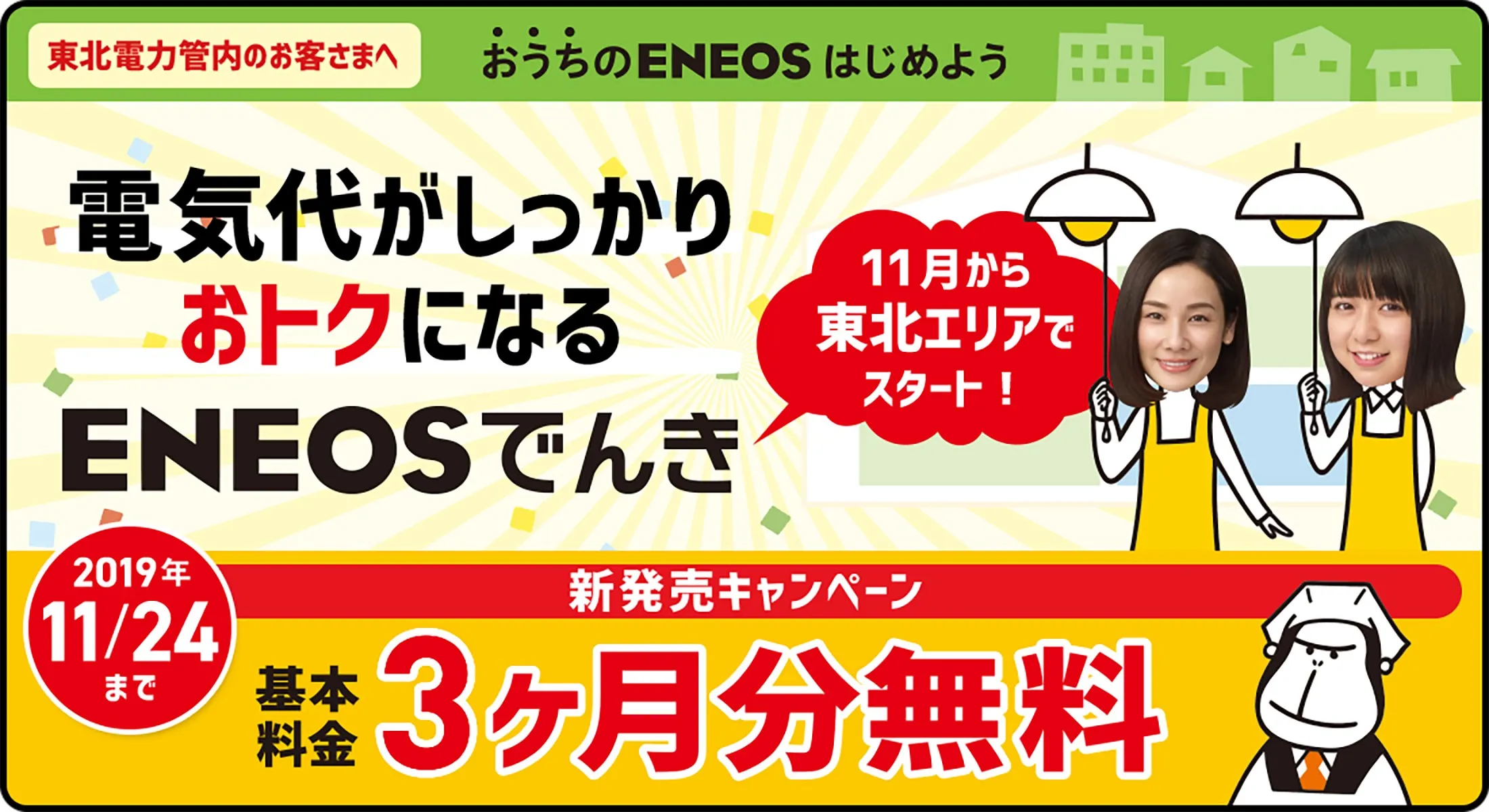 また、2019年11月1日(金)から11月24日(日)までの間に、東北電力エリアで新規お申し込みいただいたお客様を対象に、「基本料金が3ヵ月分無料」となる「新発売キャンペーン」※2を実施いたします。ぜひこの機会におトクな「ENEOSでんき」をご利用ください。
