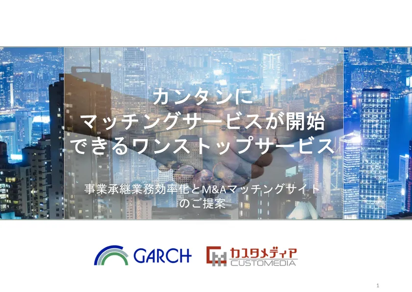 ジーアーチ株式会社(所在地:東京都中央区銀座、代表取締役社長:加藤 博敏)は、事業承継先を探す企業や個人と、事業承継を受ける企業や個人の双方が登録し、マッチングを図るサービスなどを簡単に立ち上げることができる「ジーアーチ匠マッチング」(事業承継、M&A、不動産、人材紹介等マッチングサイト貸与・運営サービス)を株式会社カスタメディア(所在地:兵庫県神戸市中央区磯上通、代表取締役社長:宮崎 耕史)と共同で提供を開始しました。
