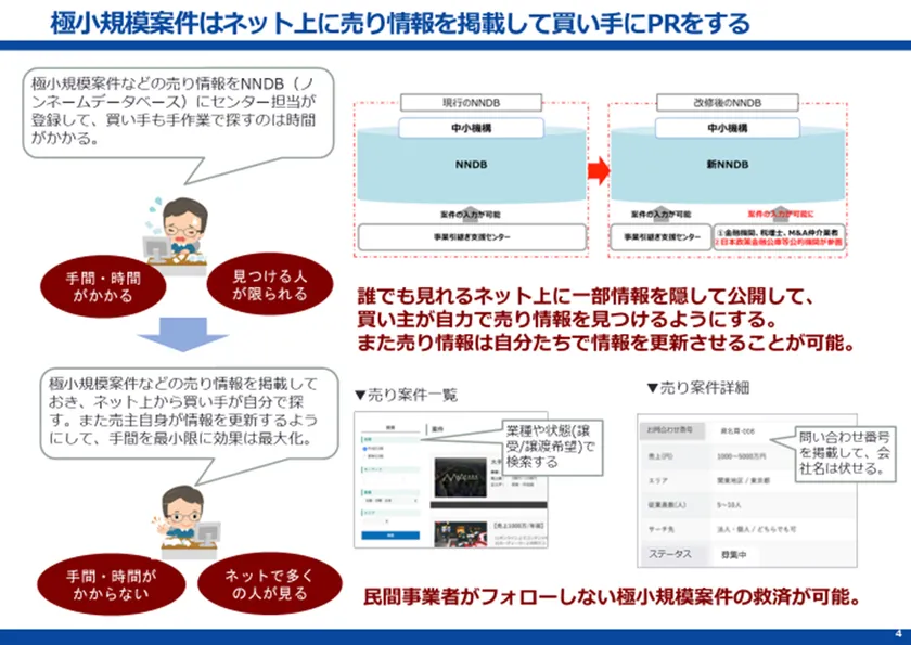 経営者の高齢化により後継者不足が社会問題となる中、従来のM&Aは、やりとりする金額が高額であり、「専門家」の仲介無しにはできないようなビジネスが多く、素人にはなかなか手を出しにくいものでしたが、人に依存せずできるインターネットのマッチングサービスの普及により「大規模案件」でなくてもM&Aが可能となり、「専門家」でなくてもM&Aが可能となって来ました。