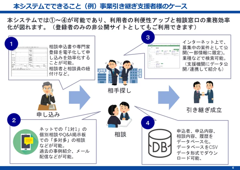 通常のマッチングシステム開発に伴う膨大な時間とコストの大幅な軽減が可能。(初めからの仕様検討の労力・時間等)お申し込みからサイトオーナーとしての運用開始まで最短2週間で可能です。少額の使用料で、特許出願中の新しい事業承継ビジネスモデルの内容を活用可能です。