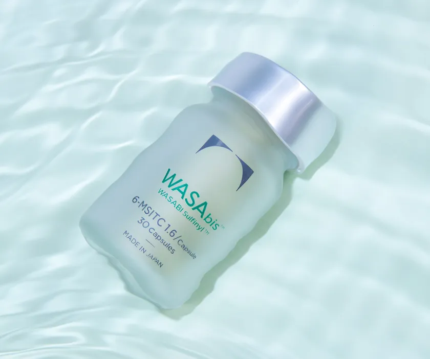 「ワサビスルフィニル(R)」※3は、本わさびをすり下ろして抽出し、わさび特有の辛み成分を取り除いた成分で、希少な健康成分である「6-MSITC(6-メチルスルフィニルヘキシルイソチオシアネート)」を含有していることが特徴です。「ワサビスルフィニル(R)」に関しては、その製造元であり、わさび研究のトップランナーとして常に最先端のテクノロジーを導入している金印株式会社により、多くの研究が報告されており、体の中からきれいにする多面的な有用性が期待されております。