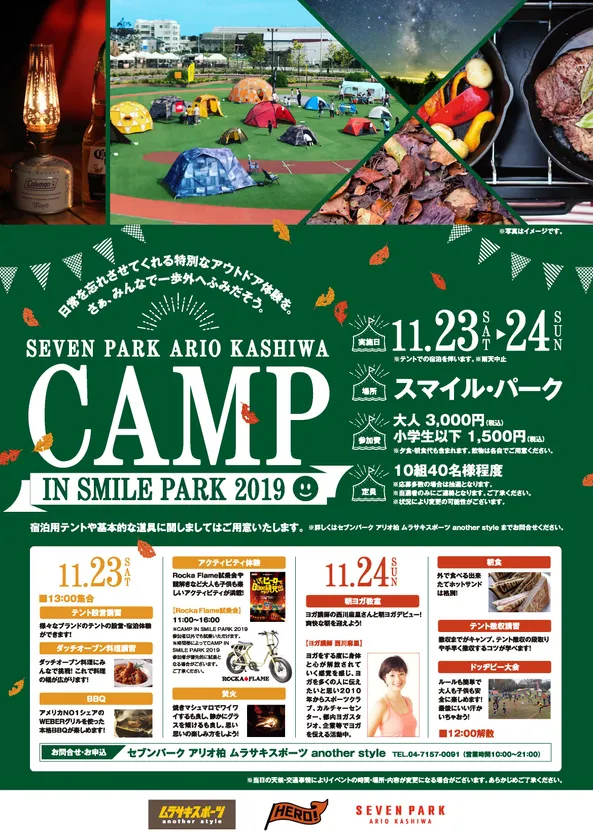 株式会社セブン&アイ・クリエイトリンク(所在地:東京都千代田区、代表取締役社長:泉井 清志)が開発・運営する大型ショッピングセンター「セブンパーク アリオ柏」(所在地:千葉県柏市)では、2019年11月23日(土)と24日(日)の2日間、屋外広場スマイル・パークにてテントでの宿泊を体験できるキャンプイベント「CAMP IN SMILE PARK 2019」を開催いたします。
