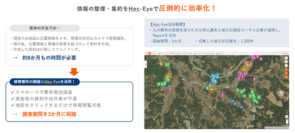 以前は、現場の位置情報は白地図に付箋を貼り、写真はカメラで別管理していたものを、HecーEyeでは「調査と同時に報告、管理することが可能」です。それにより、調査〜復興依頼までの時間を圧倒的に短縮することができます。