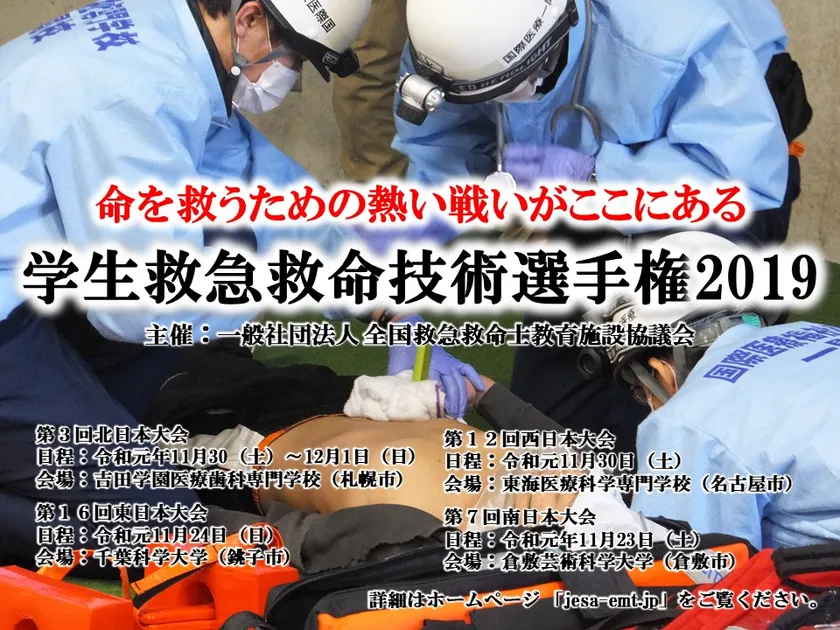 一般社団法人全国救急救命士教育施設協議会(JESA)は、「学生救急救命技術選手権2019」を11月に開催いたします。当選手権は全国を4ブロックに分けて毎年開催されており、今年は岡山県倉敷市(11/23)、千葉県銚子市(11/24)・愛知県名古屋市(11/30)・北海道札幌市(11/30~12/1)で実施されます。一般見学可能(入場無料)となりますので、興味のある方はどなたでもご観覧いただけます。