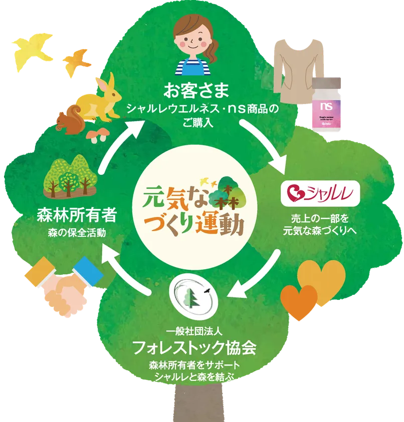 レディースインナー・化粧品・健康食品等販売の株式会社シャルレ(本社:神戸市、代表取締役社長:奥平 和良)は、前年度に続き2019年12月1日より、日本の森林を保全する活動「元気な森づくり」運動を実施します。機能性商品「シャルレウエルネスシリーズ商品」および健康食品「nsブランド商品」の対象期間中の売上の一部を一般社団法人フォレストック協会を通じて森林保全に役立てます。日本の森林が豊かになることで、生物の生育や地球温暖化防止などに貢献し、地球の元気につなげます。