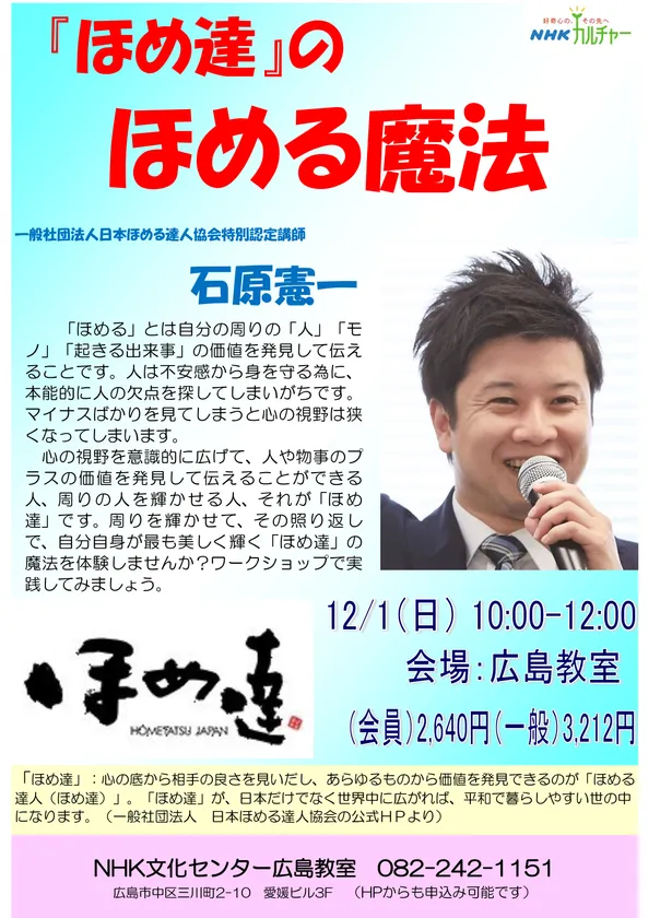 広島県初※の「ほめる自動車教習所」の公認、株式会社海田自動車学校(本社:広島県安芸郡海田町蟹原1-4-73、ほめ達特別認定講師:石原 憲一)は、2019年12月1日(日)NHK文化センター広島教室にて、メディアでも話題のほめる達人による「ほめ達」のほめる魔法を開催します。