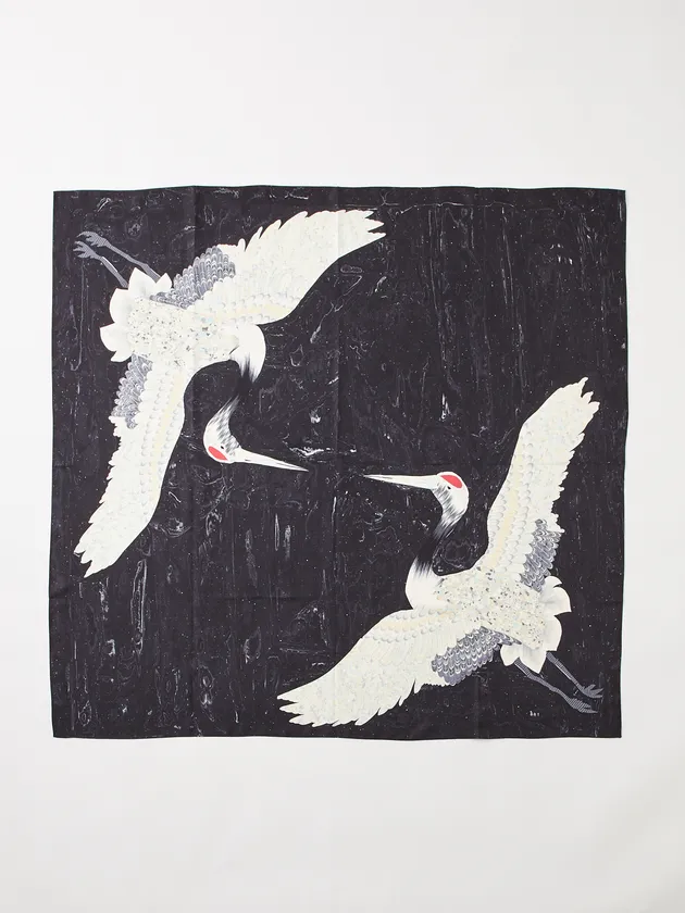ご招待の方には、京都にある世界で唯一のマーブル染めを行う染工場で染めたKIIROオリジナルテキスタイルの鶴柄スカーフと、KIIROオリジナルラベルを施したスパークリング日本酒をオープニング記念としてご用意しています。スパークリング日本酒は、明治25年創業の出羽桜酒造株式会社(山形県)とのタイアップで、当日はミス日本酒による日本酒サーブを企画しております。