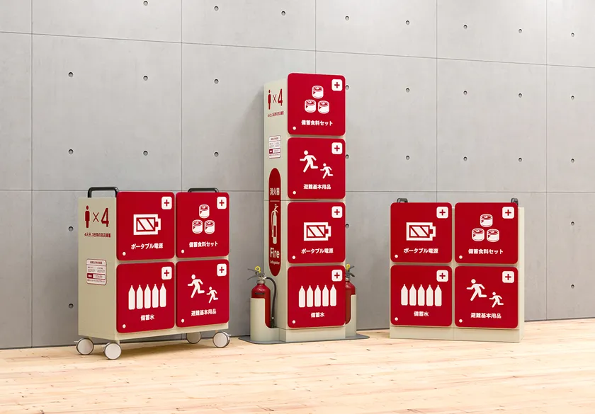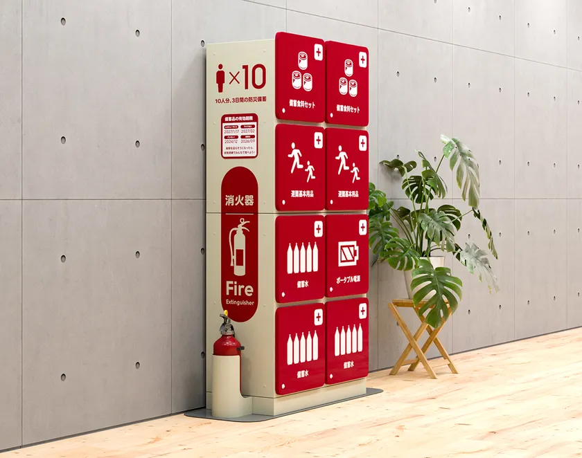 備蓄品の存在を従業員に覚えてもらい、内容物についても興味を持ってもらうことが大切になるため、オフィス内に置くことができるデザインの保管庫です。赤色で存在感を高め、来客にも備えがあることを伝えることができます。