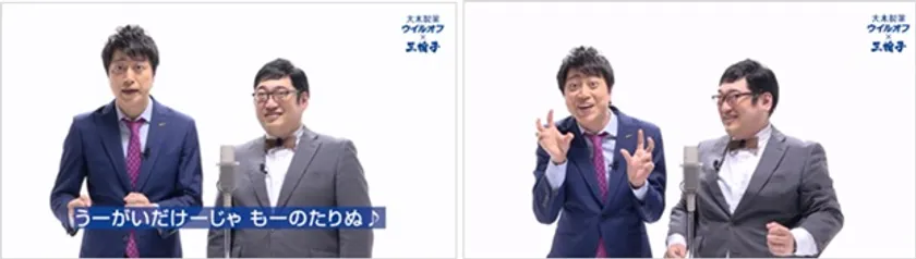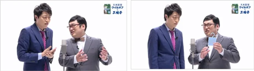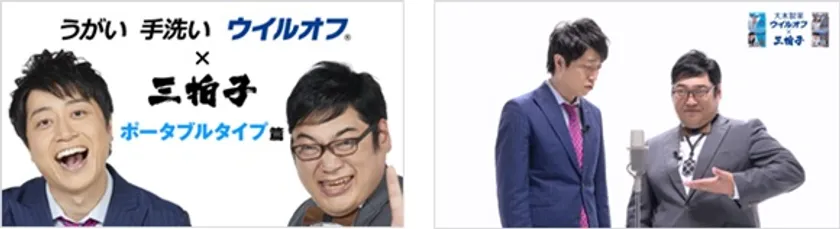 コラボシリーズ全4弾の最終コラボ漫才ムービーでは、三拍子が外出時のウイルス対策を皆さんに紹介。冒頭、三拍子にちなんだ「うがい 手洗い ウイルオフ」の掛け声とともに、ムービーがスタート。冒頭ツッコミ担当の久保(画像右)の「どんなウイルス対策をしているか?」の振りに対して、ボケ担当の高倉(画面左)が答えていき……そこから久保がお勧めのウイルス対策を高倉に教えるのだが、コンビ漫才のはずが……