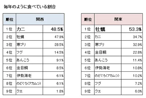 関西は「カニ」、関東は「牡蠣」を、毎年のように食べている?