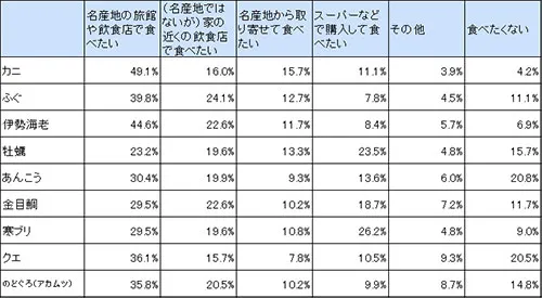 冬の味覚をどのような場所や方法で一番食べてみたいと思うかという質問には、カニ、フグ、伊勢海老が特に「名産地の旅館や飲食店で食べたい」と答える人が非常に多い結果となりました。