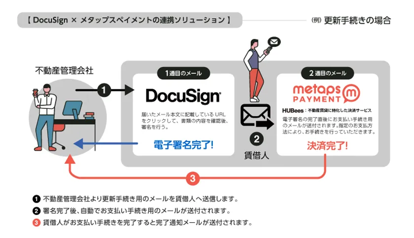 ドキュサイン・ジャパン株式会社(本社:東京都港区、以下 ドキュサイン)と株式会社メタップスペイメント(本社:東京都港区)は、電子署名と決済サービスHUBeesの連携ソリューションの提供を開始します。本サービスは、賃貸借契約の更新手続きをデジタル化すると共に、請求から支払いまでを一連のプロセスで完結することを可能とし、より迅速な取引の実現を目指します。