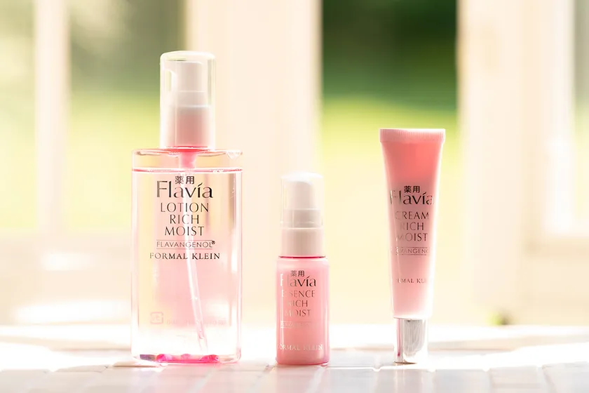 フラバンジェノール(R)(※5)はフランス南西部に生育する海岸松の樹皮から抽出された天然由来のポリフェノールです。高濃度(※6)フラバンジェノール(R)の美肌パワーは、ビタミンCの約600倍、コエンザイムQ10の約250倍、セラミドの約15倍、コラーゲンの約5倍と言われています。フラビアシリーズは、高濃度フラバンジェノール(R)を配合し、年齢肌の乾燥ダメージにパワーを発揮します。