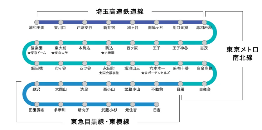 ダイナミックビークルスクリーンを搭載した埼玉高速鉄道の車両は、埼玉高速鉄道線、東京メトロ南北線、東急目黒線を直通運転しており(一部異なる編成もあり)、これら3車線を走行する車両のおよそ3分の1が埼玉高速鉄道の車両です。