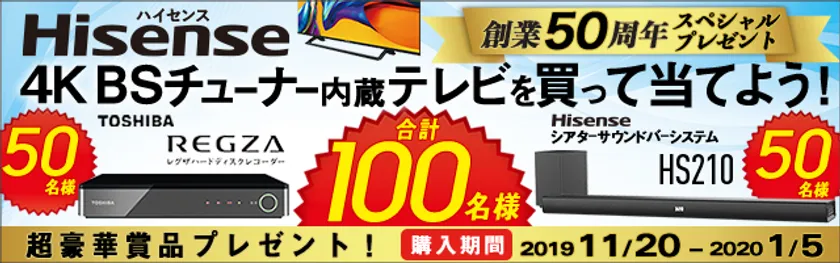 総合家電メーカー、ハイセンスジャパン株式会社(所在地:神奈川県川崎市、代表取締役社長:李 文麗)は、創業50周年を記念して、期間中に対象商品(4K BSチューナー内蔵テレビ※一部機種除く)をお買上げの方に東芝「レグザハードディスクレコーダー D-4KWH209」、11月に発売されたハイセンスの新商品「シアターサウンドシステム HS210」を抽選で各50名、合計100名様にプレゼントするキャンペーンを11月20日(水)より開始します。